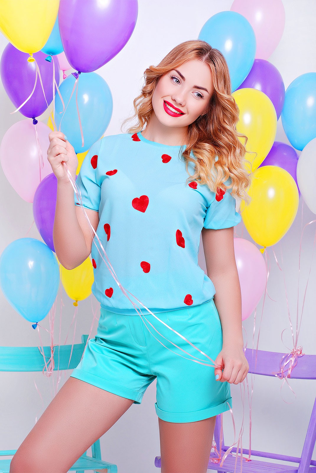 Свободная блуза "Comfort" без пуговиц из легкого креп-шифона. Имеет круглый вырез горловины, короткий рукав. Модель выполнена в красивом голубом цвете с вышивкой в виде сердечек. Отлично сочетаться с блузкой будут шорты, джинсы, юбки.